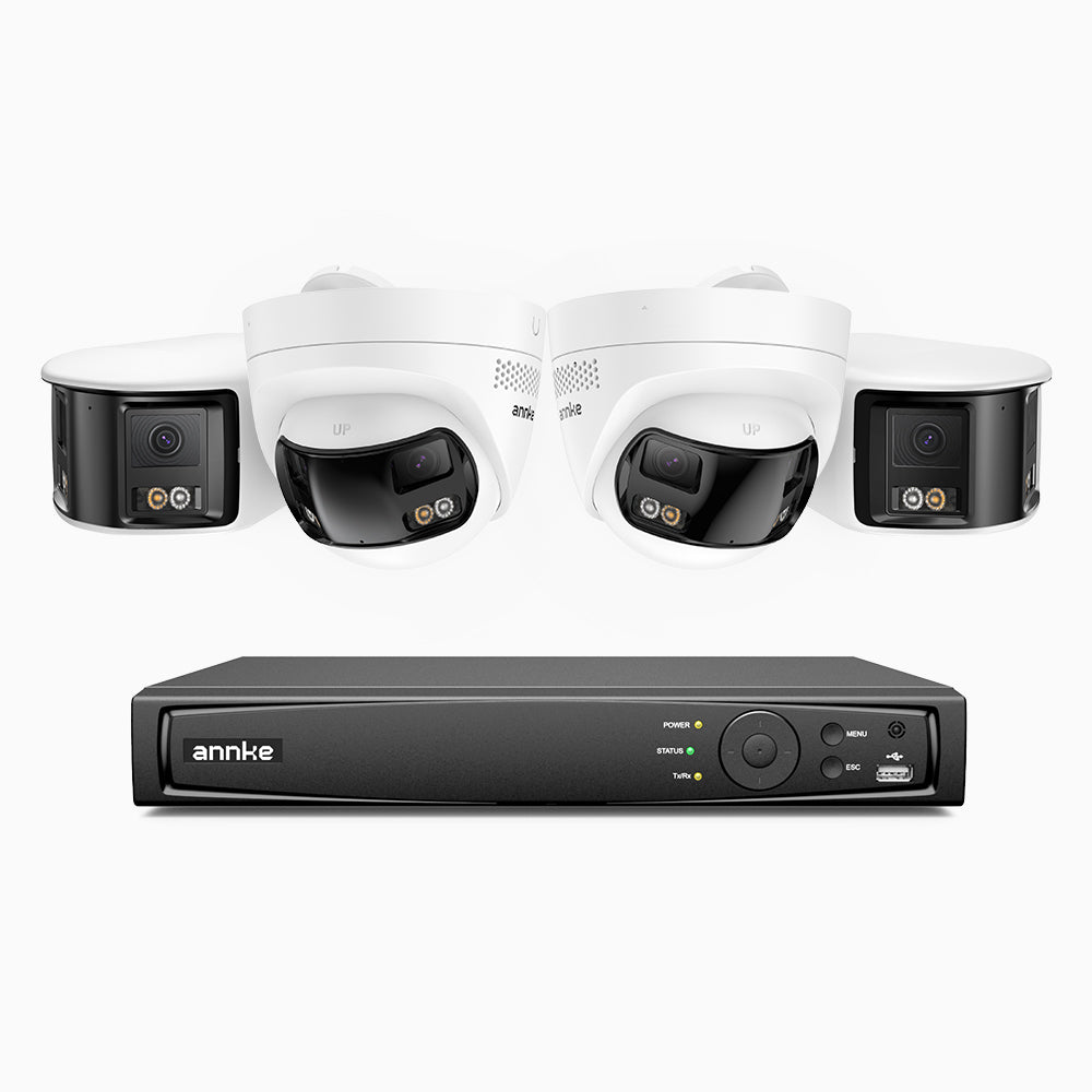 FDH600 - 8 Channel PoE Security System with 2 Bullet & 2 Turret Dual Lens Cameras, 6MP Resolution, 180° Panoramic View, Smart Dual Light Night Vision, Two-Way Audio, Active Siren & Alarm, Human & Vehicle Detection, IP67