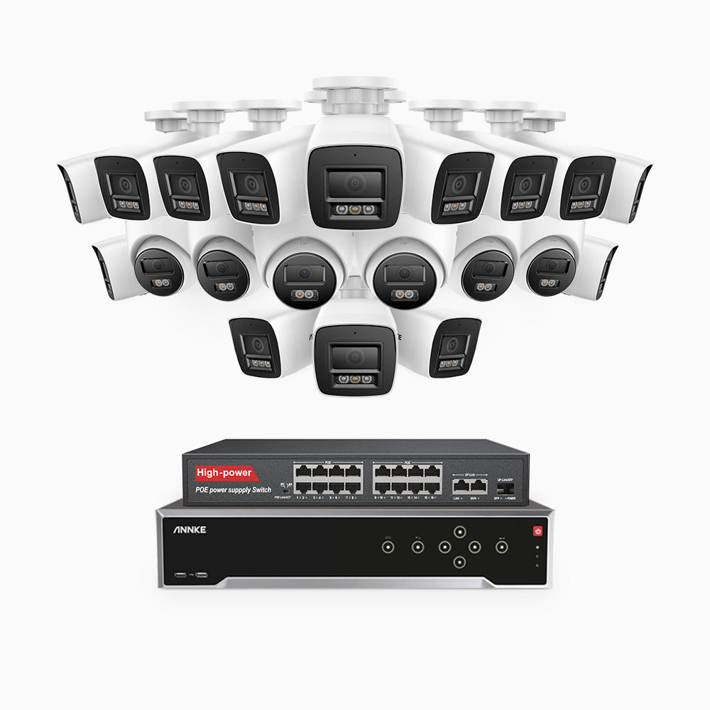 H800 - 4K 32 Channel PoE Security System with 14 Bullet & 6 Turret Cameras, Human & Vehicle Detection, Color & IR Night Vision, Built-in Mic, RTSP Supported, 16-Port PoE Switch Included