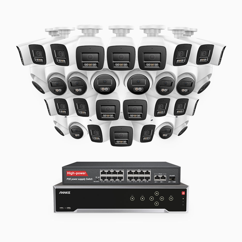 H800 - 4K 32 Channel PoE Security System with 20 Bullet & 12 Turret Cameras, Human & Vehicle Detection, Color & IR Night Vision, Built-in Mic, RTSP Supported, 16-Port PoE Switch Included