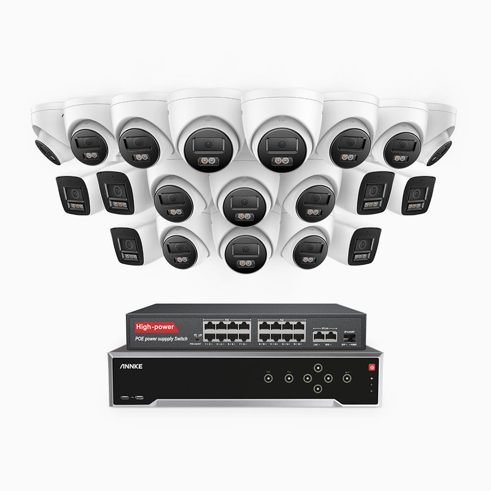 H800 - 4K 32 Channel PoE Security System with 6 Bullet & 14 Turret Cameras, Human & Vehicle Detection, Color & IR Night Vision, Built-in Mic, RTSP Supported, 16-Port PoE Switch Included
