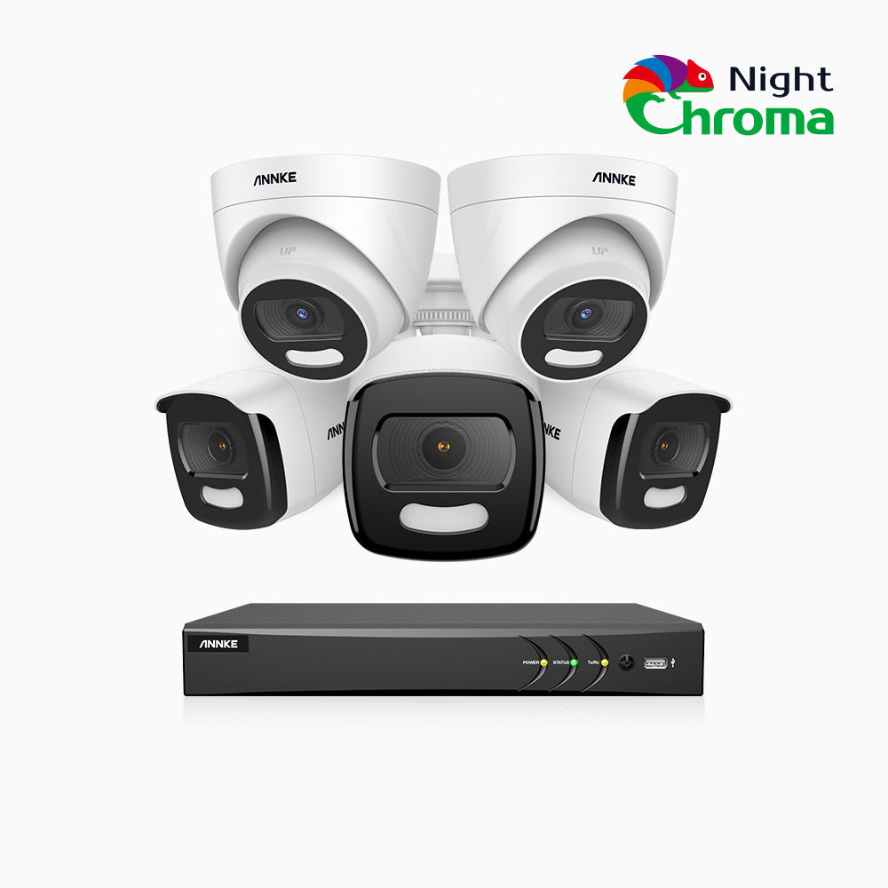 NightChromaTM NCK500 - 3K 8 Channel PoE Security System with 3 Bullet & 2 Turret Cameras, Acme Color Night Vision, f/1.0 Super Aperture, Active Alignment, Built-in Microphone, IP67